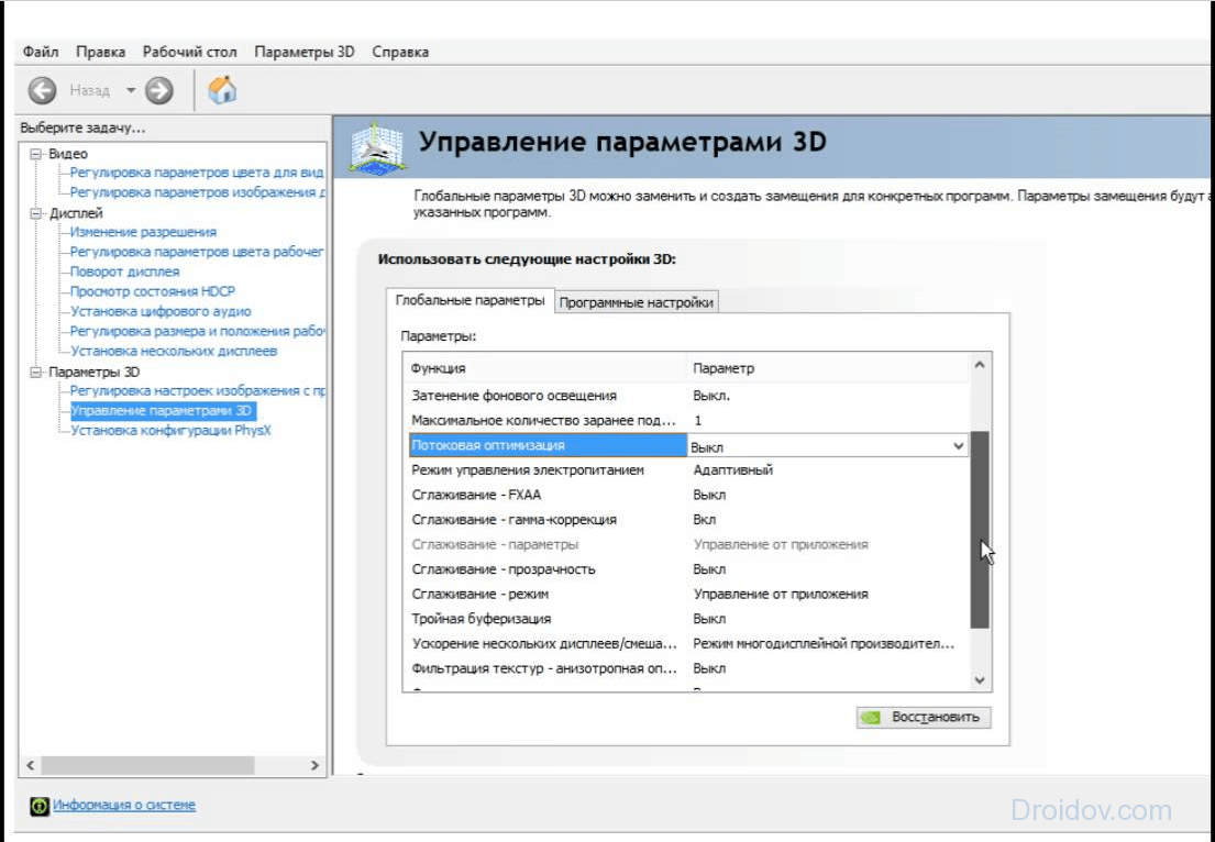 Для карт NVIDIA открывайте панель управления – кликайте в пустом месте рабочего стола мышкой и выбирайте одноименный пункт. Переходите на «Управление параметрами 3D» и отключайте:
