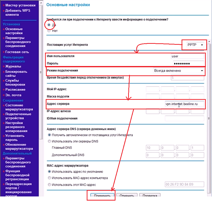 Для настройки типа PPTP соединение нужно ввести данные: