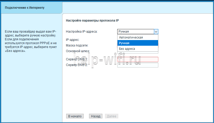 Ставим ручную или автоматическую настройку IP. Второй тип возможен, если покупатель дополнительно брал у провайдера опцию «Статический (уникальный) IP в интернете». При покупке вам должны были предоставить адрес, маску, шлюз и DNS — всё это необходимо очень внимательно ввести в настройках роутера.