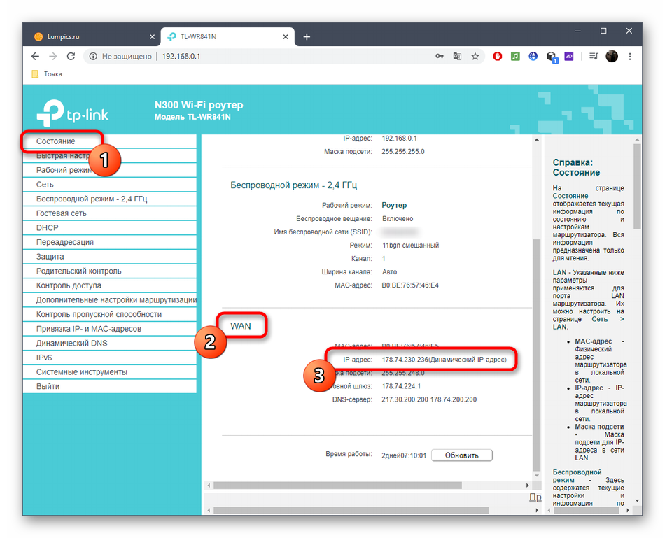 Обратите внимание на блок «WAN», где нужно запомнить текущий IP-адрес, а также узнать, какой протокол используется для соединения