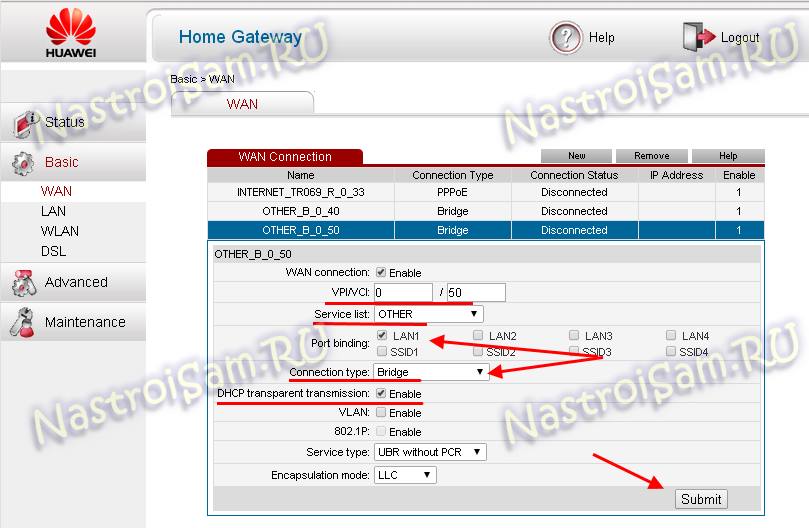 Вводим значения VPI и VCI для IPTV, в списке «Service List» выбираем пункт «Other», а в разделе «Port binding» ставим галку на тот порт, в который будет включена STB приставка. При этом заметьте, что «Connection type» надо выбрать «Bridge» — это значит что соединение будет типа «прозрачный мост». Так же я бы советовал поставить галку Enable напротив пункта «DHCP transparent transmission». Применяем настройки нажатием «Submit».Настройка сети WiFi