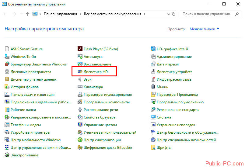 Перейдем к настройке звукового диспетчера Realtek. Открываем панель управления (как это сделать описано здесь), переходим в раздел «Диспетчер HD».