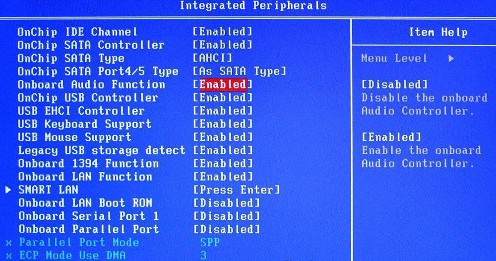 - В разделе «Integrated peripherals» (может называться по-другому) найти опцию «Onboard audio function», «High definition audio» или что-то подобное. Если опция выключена («Disabled»), используя стрелки, перевести ее в состояние «Enabled».