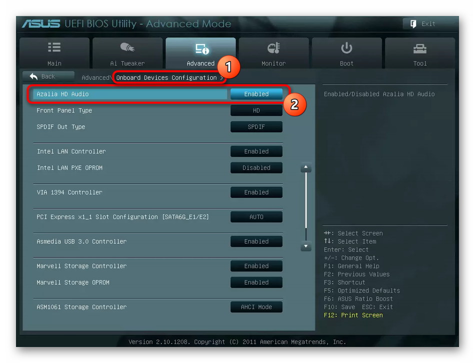 Через Биос возможно включать и отключать компоненты системы, в частности, стоит проверить состояние звукового устройства. Для этого: