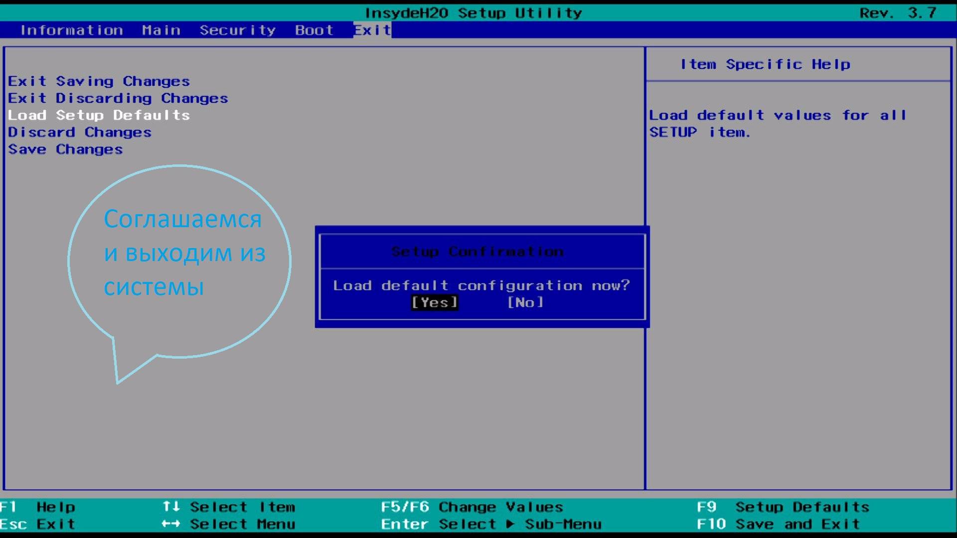 Неполадки со звуком могут быть вызваны сбоем bios, потребуется его сбросить. Чтобы войти в эту программу при включении ноутбука необходимо нажать кнопку Del или кнопку F*, у разных брендов все индивидуально и вход в биос на ноутбуке Асус может отличаться от Леново. Сам сброс осуществляется в меню Exit – Load Setup Defaults. Откроется окно с подтверждением действия. Соглашаемся и выходим из системы. После чего загружаем ноутбук и смотрим — был ли достигнут желаемый эффект.