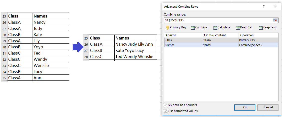 3. Нажмите Ok. Затем ячейки были объединены без потери данных.