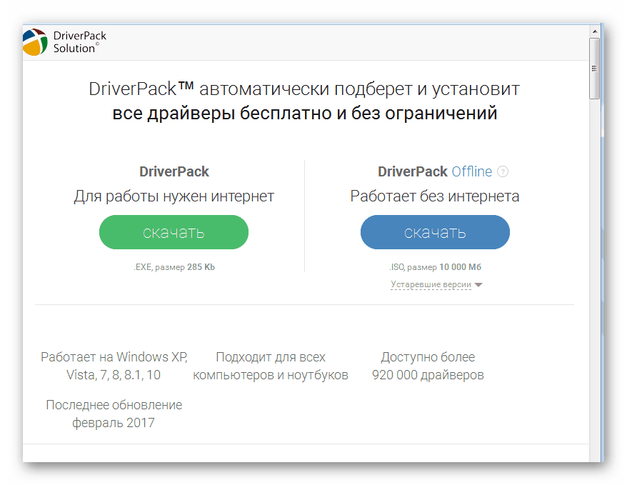 DriverPack предлагает разные варианты загрузки драйверов. Какой из них выбрать, зависит от того, работает интернет или нет.