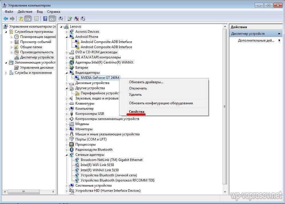 Заходим в подраздел «Диспетчер устройств», выбираем то, ID которого хотим определить (обычно оно именуется как «Неизвестное устройство»). Я буду показывать на своей видеокарте, которая определается компьютером для того, чтобы проверить, насколько правильно сервис его определит. Итак, кликаем по нему правой кнопкой мыши и выбираем «Свойства»