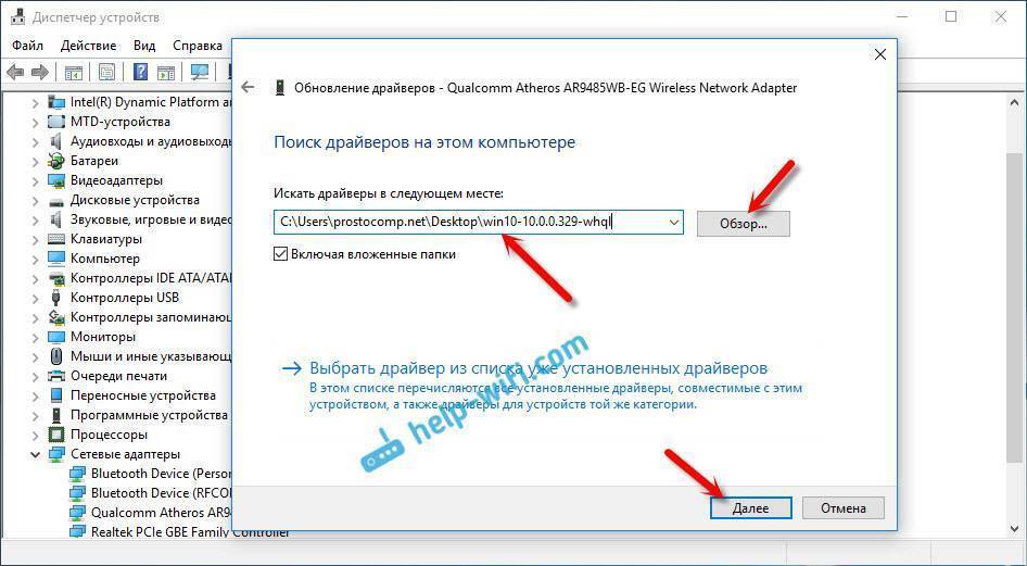 Нажав на кнопку “Обзор”, выбираем папку, в которую мы извлекли скачанные драйвера. Нажимаем на кнопку “Далее”.