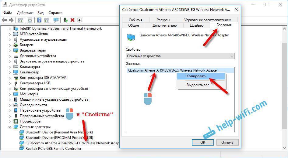Нажимаем на адаптер правой кнопкой мыши и выбираем “Свойства”. Затем, переходим на вкладку “Сведения”. Нажимаем правой кнопкой мыши на название, и выбираем “Скопировать”.