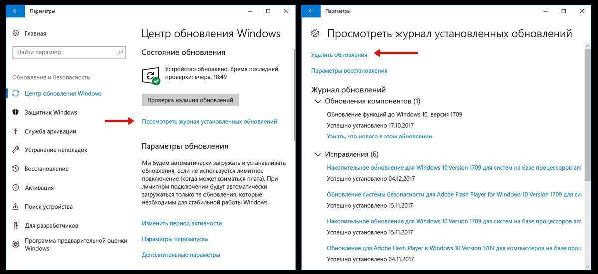 Удаления конкретных обновлений Windows 10 производится так: на самом верху журнала обновлений надо выбрать ссылку «Удалить обновления», а затем в открывшемся окне выбрать ненужные более пункты и, кликнув по ним ПРАВОЙ кнопкой мыши, нажать «Удалить».