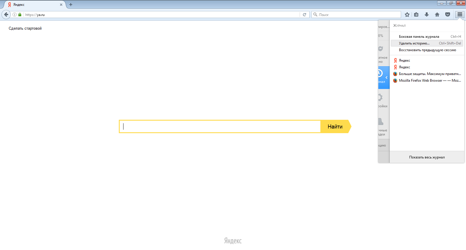 Yandex. Для очистки журнала посещений нажимаем на маленькую кнопку с горизонтальными линиями в верхнем правом углу и открываем Историю.
