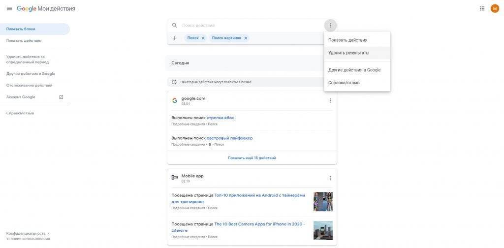 В верхней части есть выпадающий список «Удалить». Можно выбрать, за какой временной промежуток необходимо удалить историю.