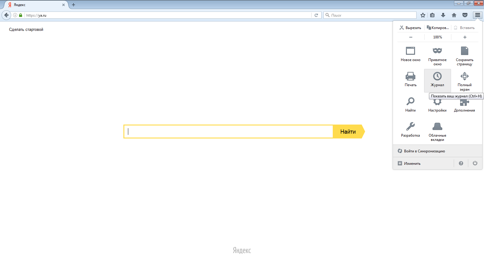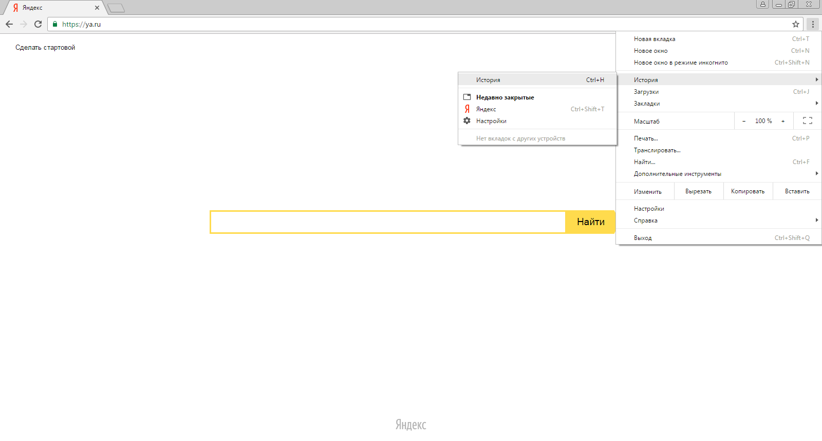 Это приложение является наиболее востребованным у русскоязычной аудитории. Российская разработка по многим параметрам обгоняет Google Chrome, а потому в сопоставимой степени пользуется популярностью. Здесь просмотр меню осуществляется следующим образом: