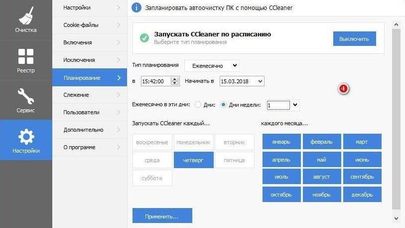 В разделе «Планировщик» можно задать расписание проведения очистки и глубину проверок.