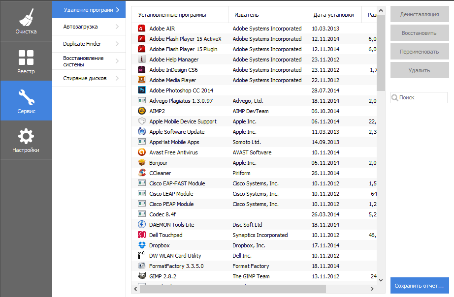 Из дополнительных функций, представленных на вкладке «Сервис», можно отметить удаление программ из автозагрузки, просмотр расширений браузеров, анализ дисков, поиск дублей.