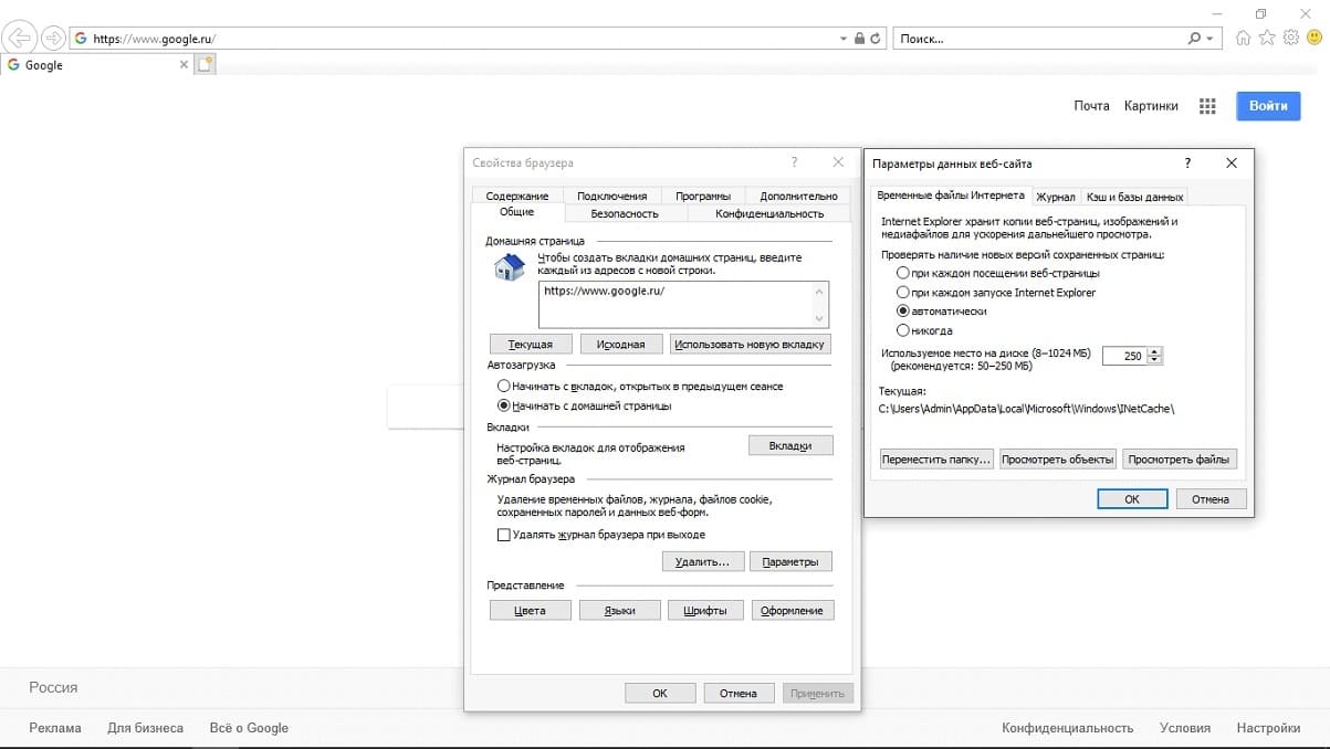 Ещё вы можете тонко настроить обновление кэша и задать максимально допустимое место, которое он может занимать. Для этого шестеренку в правом верхнем углу экрана, выберите “Свойства браузера.” Там, во вкладке “Общие”, в разделе “Журнал браузера” кликните на кнопку “Параметры”, выберите раздел “Временные файлы Интернета.” Здесь вы можете установить проверку обновлений для новых версий страниц, задать используемое для него место, посмотреть и переместить папку, где он будет храниться, просмотреть сами файлы, которые входят в кэш.