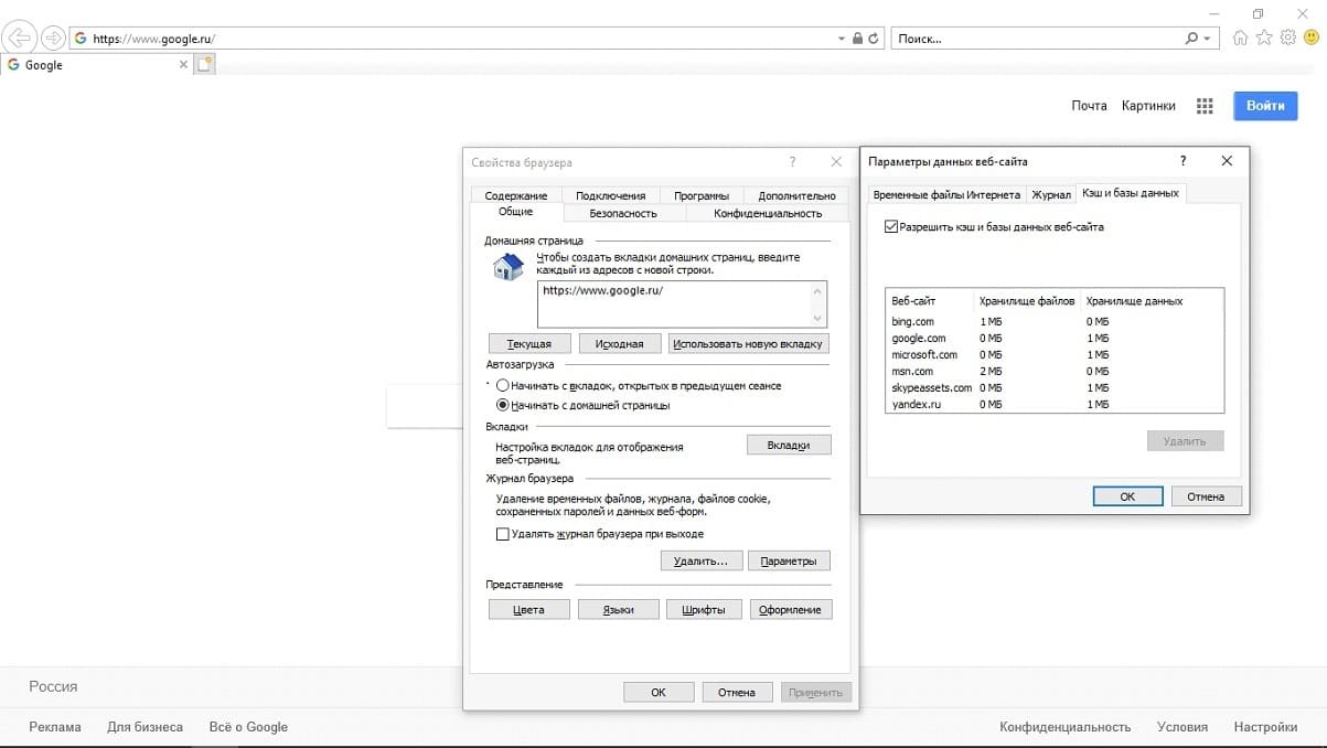 Если вы просто хотите посмотреть те сайты, временные файлы которых у вас сохранены, то нажмите на шестеренку в правом верхнем углу экрана, выберите “Свойства браузера.” Там, во вкладке “Общие”, в разделе “Журнал браузера” кликните на кнопку “Параметры”, выберите раздел “Кэш и базы данных.”