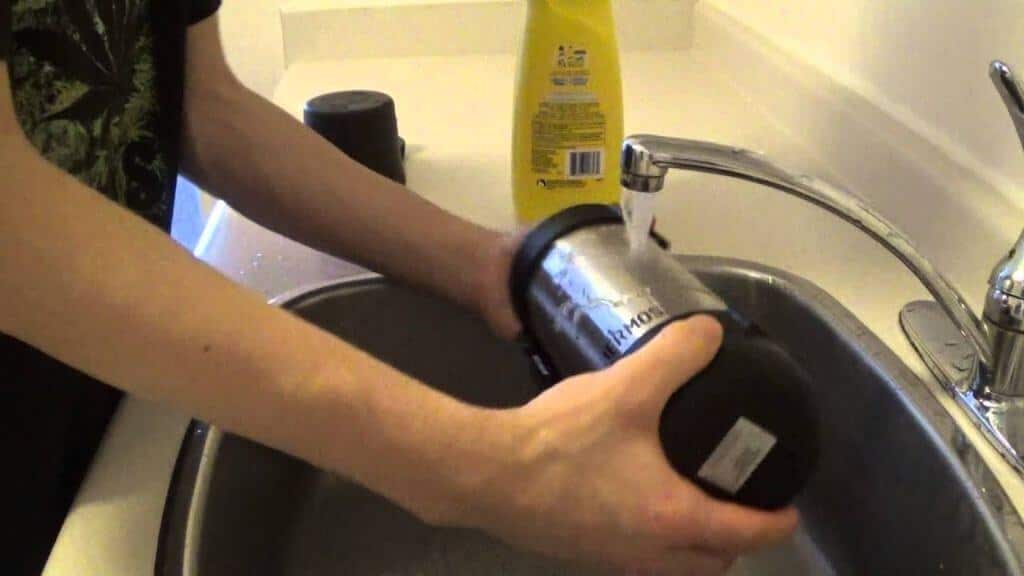 Водный раствор с пищевым уксусом помогает отмыть колбу от чая и накипи. Берут треть уксуса и две трети горячей воды, наливают в колбу. Через 2–6 часов как следует промывают изделие с гелем для посуды.