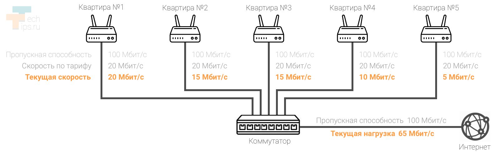 Клиент из квартиры №1 обратился в поддержку и оператор по ошибке повысил тариф до 100 Мбит/с. Получилось, что для пяти клиентов нужен канал минимум на 180 Мбит/с, а фактически он равен 100 Мбит/с. Поэтому в зависимости от действий клиентов, скорость будет меняться, но сумма не превысит 100 Мбит/с.
