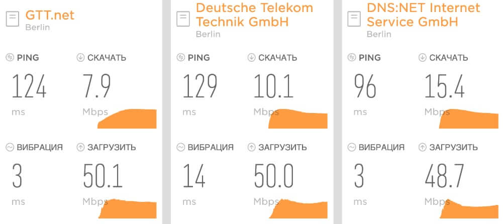 3 теста до Берлина, средняя скорость — 11,1 Мбит/с при тарифе в 50 Мбит/с