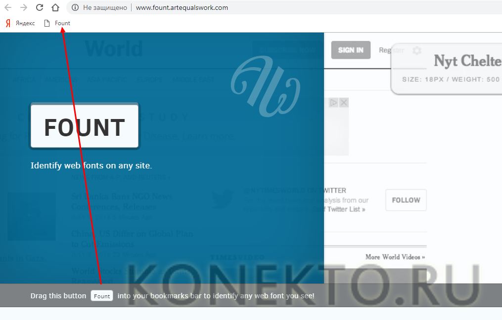 Fount работает как букмарклет – добавляете его в панель инструментов вашего браузера. Далее на тех или иных сайтах он будет показывать не только используемый шрифт, то и его размер, стиль, вес. Совместим с Chrome, Safari, Firefox и IE8+.