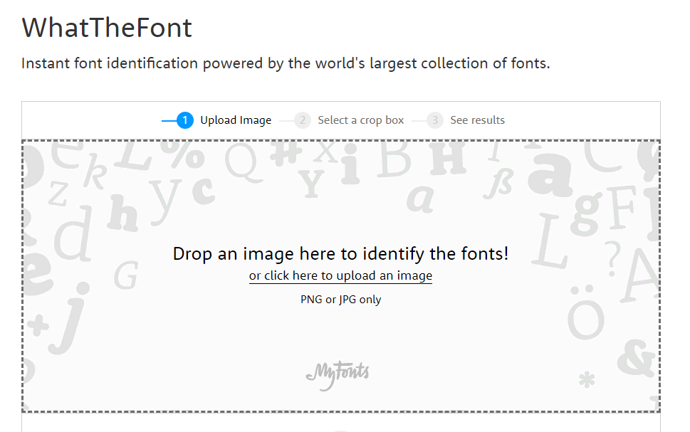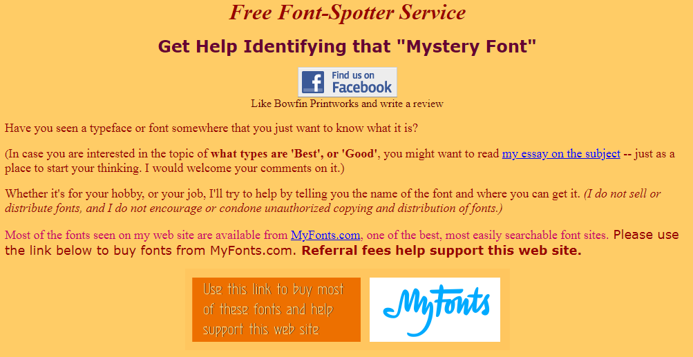 Myfonts.com — умный сайт, на котором Вы можете не только получить высококачественную услугу определения англоязычного шрифта, но и помощь экспертов типографии. Несмотря на отсутствие поддержки русского языка, приятный дизайн позволит без труда разобраться в онлайн-программе.