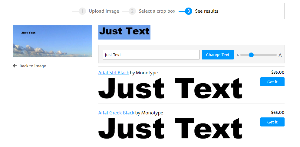 Через некоторое время система проанализирует базу и предложит один или несколько вариантов шрифта, максимально напоминающих тот, который представлен на картинке. Идентификация осуществляется буквально в несколько кликов.