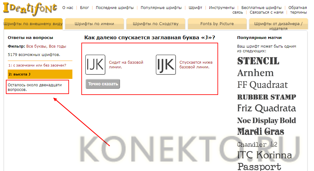 Следующий инструмент, который поможет «узнать» понравившийся шрифт, – Identifont. Программа ничем не уступает описанному выше конкуренту, однако на работу с ней придется затратить немного больше времени. Основная отличительная особенность продукта – перед тем, как запустить идентификацию, необходимо ответить системе на ряд вопросов, касающихся элементов интересующей вас типографии: