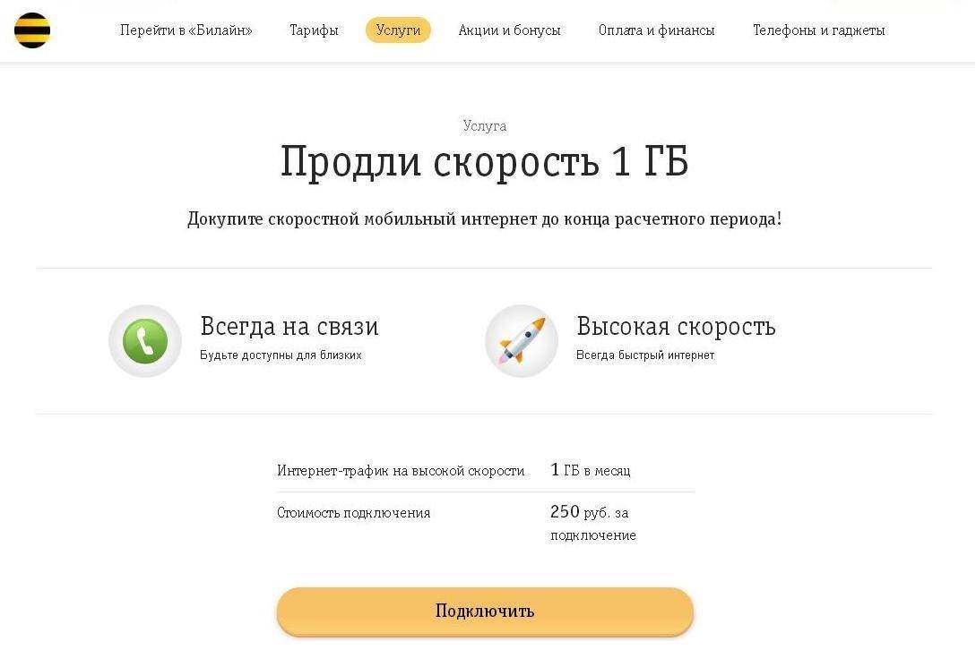 После расходования гигабайтов из основного тарифа Билайн скорость передачи данных в сети уменьшается до 64 Кб/секунду. Чтобы ее повысить, нужно обновить закончившийся пакет скоростного интернета.
