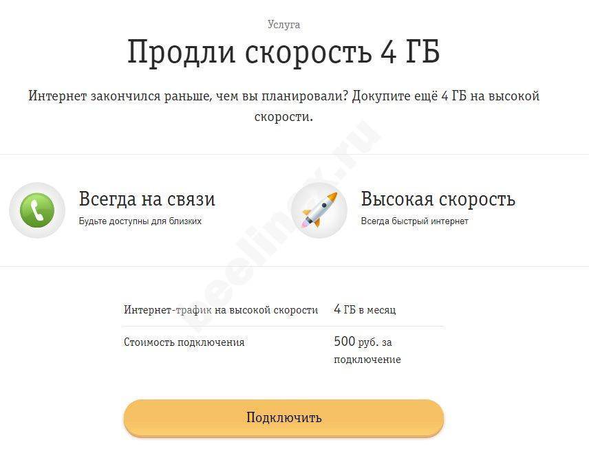 Стоимость дополнительных 4Гб Интернета обойдется клиенту от 175 до 500 рублей, в зависимости от региона проживания. Подробнее можно узнать на сайте Билайна. Действует услуга 30 дней с момента активации. Максимальная скорость в сети 3G – 21, 6 Мб/сек, снизится до 64 кб/сек после израсходования дополнительного пакета Интернета или после окончания периода действия опции.