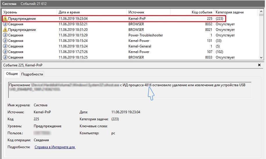 Затем перейдите по пути Журналы Windows – Система. Здесь из длинного списка различных событий нужно найти записи «Kernel-PnP» с примерно таким текстом: «Приложение с ИД процесса xxx остановило удаление или извлечение для устройства…»