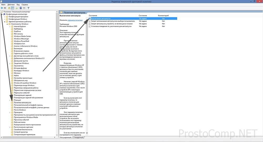 Переходим по пути Конфигурация компьютера > Административные шаблоны > Компоненты Windows > Политики автозапуска. У вас будут доступны вот такие пункты