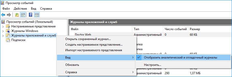 С левой стороны кликните правой кнопкой мыши на вкладку «Журналы приложений и служб», затем перейдите на «Вид» в отобразившемся контекстном меню и установите флажок «Отобразить аналитический и отладочный журналы».