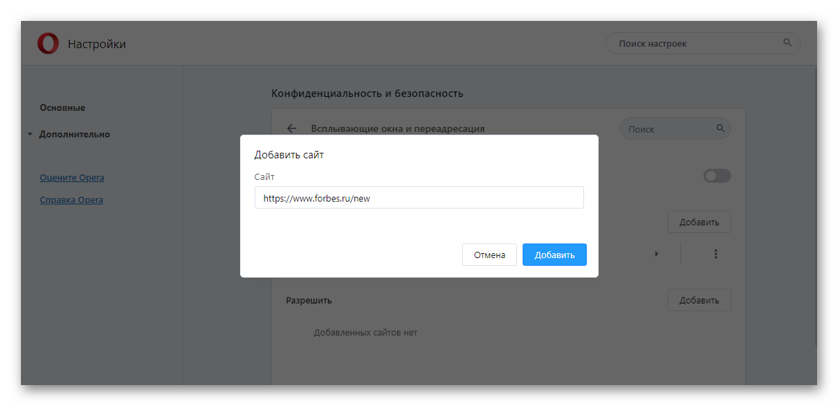 - По аналогии со всплывающими рекламными окнами здесь можно добавить отдельные ресурсы в исключения, от которых вы бы хотели получать уведомления, то есть разблокировать всплывающие окна в Опере.
