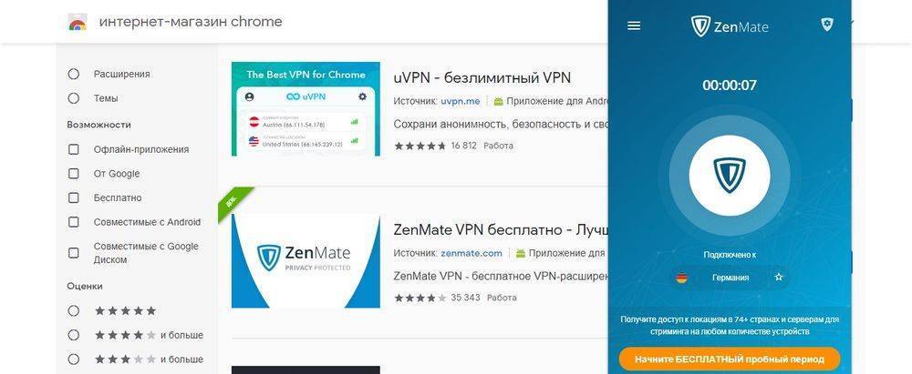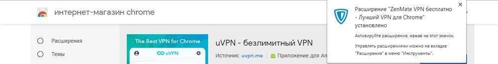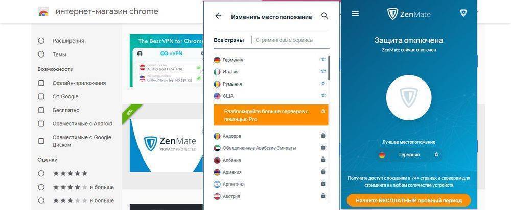 - Открывается окно ZenMate VPN. В нем можно менять геолокацию и отключать работу расширения.