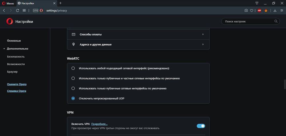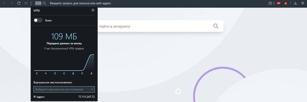 В Opera есть встроенный VPN, который удобен в использовании – нет необходимости что-то устанавливать дополнительно, достаточно кликнуть по значку и активировать опцию, передвинув ползунок.