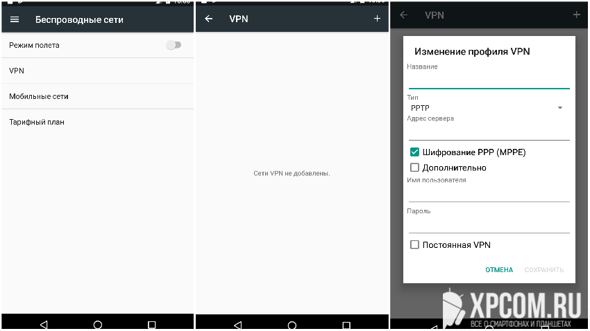 Настройка VPN на телефонах Андроид — очень проста. Зайдите в Настройки > Беспроводные сети > Дополнительные функции > VPN и нажмите на значок “+”. Введите всю необходимую информацию в появившемся окне, вы должны были получить ее от вашего поставщика VPN, и нажмите “Сохранить”.