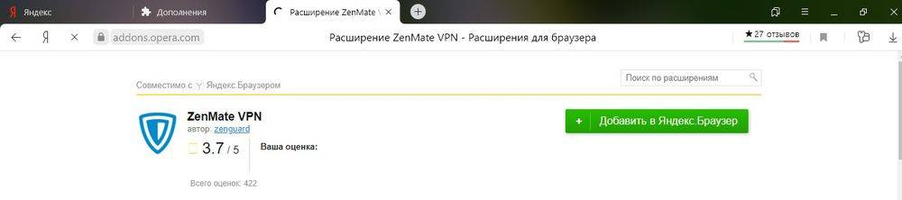 - В открывшемся окне представлен список доступных VPN для Яндекс Браузера. Выберем расширение ZenMate, нажав на него.