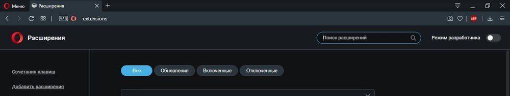 В браузере вызвать меню, кликнув по кнопке слева, и зайти в «Расширения». Или использовать сочетание клавиш Ctrl+Shift+E.