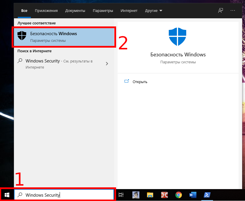 - Найдите «Безопасность Windows» (на английском «Windows Security») и щёлкните по верхнему результату, чтобы открыть приложение.