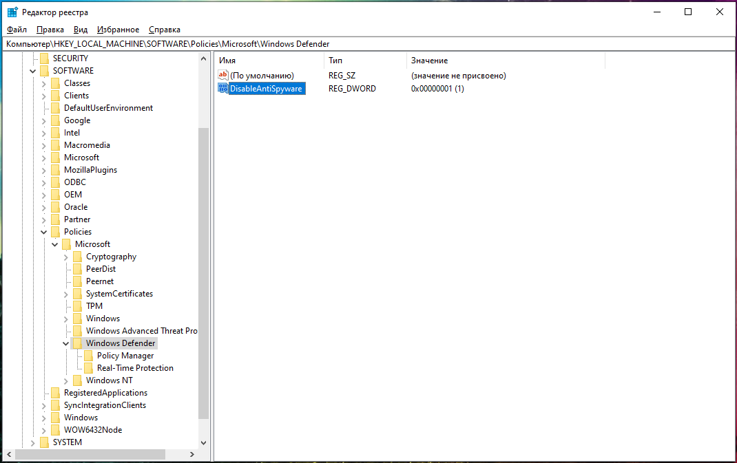 Как отключить встроенный антивирус в Windows 10 с помощью редактора реестра