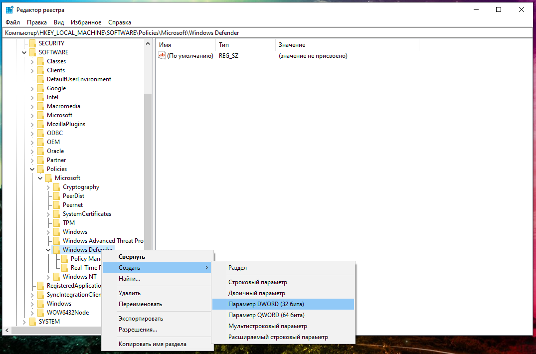 Щёлкните правой кнопкой мыши на ключ (папку) Windows Defender, выберите «Создать» и выберите «Параметр DWORD (32 бита)».