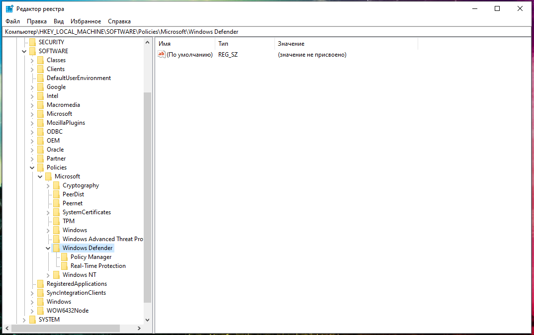 Найдите следующий путь: HKEY_LOCAL_MACHINE\SOFTWARE\Policies\Microsoft\Windows Defender