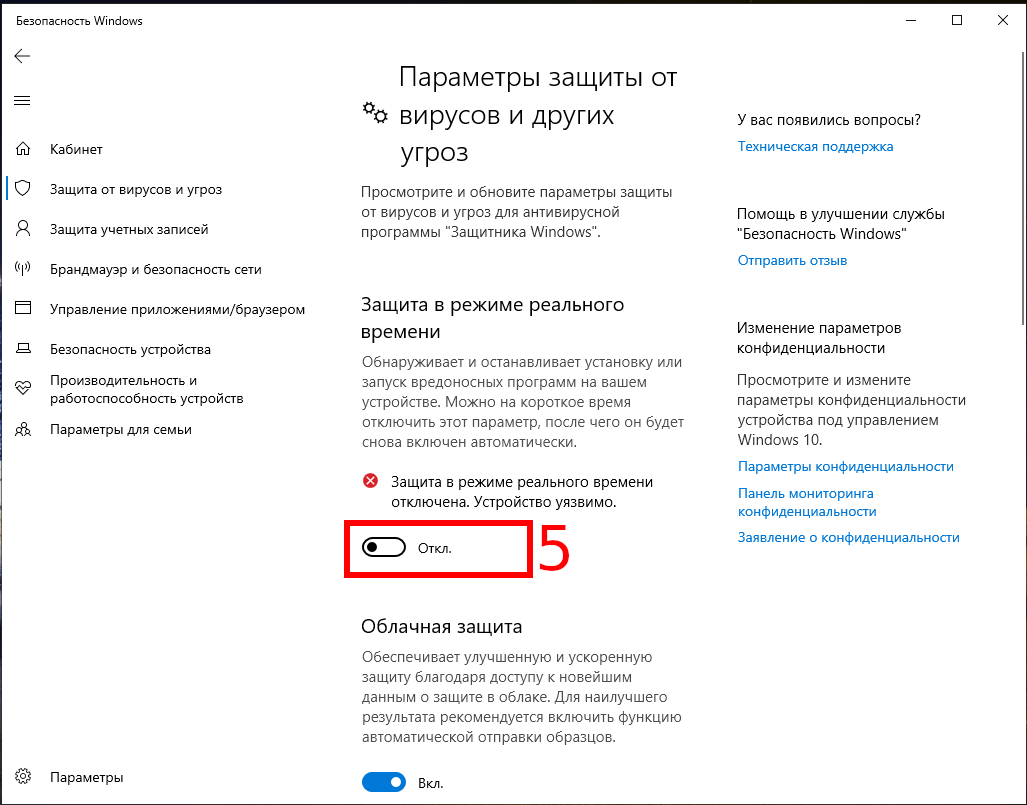 Начать нужно с отключения защиты в реальном времени, как это показано в начале инструкции.