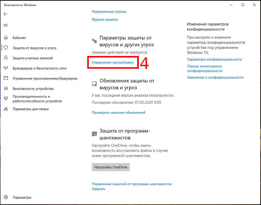 - В разделе «Параметры защиты от вирусов и угроз»