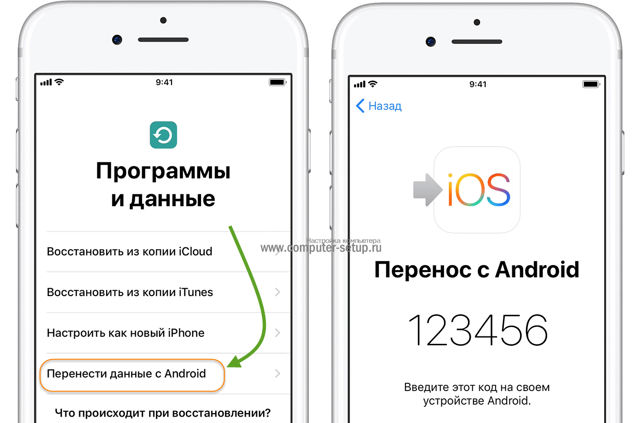 1. Включите iPhone и во время его первичной настройки перейдите в «Программы и данные» и укажите, что хотите перекинуть данные с ОС Android, далее дойдите до экрана с вводом кода.