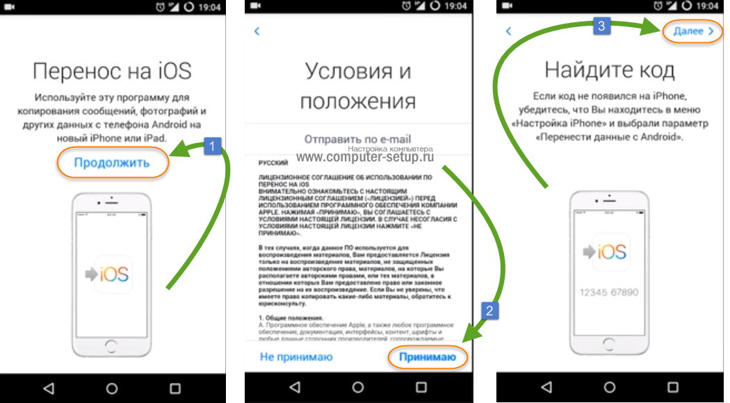 Запустите приложение и введите код с iPhone. Появится окно, где необходимо выбрать, что вы хотите перенести — сделайте активными эти пункты и начните процесс. Не отключайте телефоны, пока индикаторы переноса не станут неактивными на обоих телефонах