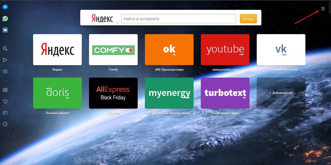 В Экспресс-панели Оперы для пользователей также существует возможность персонализации под себя, пусть и не сильно обширной и подробной. Открыть её можно так: с помощью новой вкладки открывайте экспресс панель, и рядом с правым краем окна, ближе к верху, есть небольшая круглая кнопка, на которой изображены три ползунка, а при наведении на неё высвечивается текст «Простая настройка». Она на и нужна, кликните по ней.