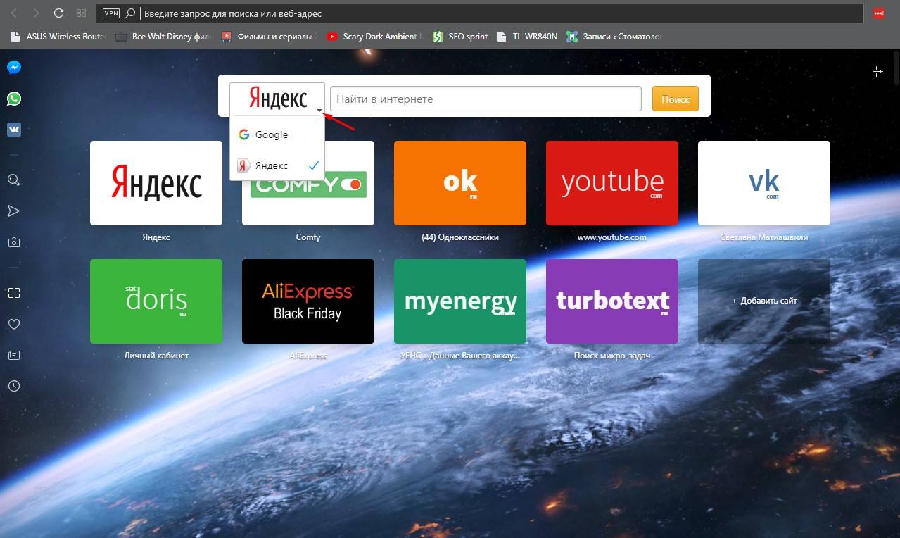 Шаг 5. Теперь нужно выбрать Яндекс в качестве поисковой системы на Экспресс панели. Для этого новой вкладкой откройте «Экспресс панель», затем нажмите на эмблему той поисковой системы, которая находится напротив строки поиска, и выберите Яндекс. К примеру, на скриншоте выбрана иная поисковая система, и для того чтобы это изменить, нужно просто кликнуть по её названию и выбрать Яндекс.
